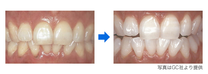・人工的な治療痕の部分、例えば被せ物や詰め物をしている所は絶対にホワイトニングでは白くなりません。)